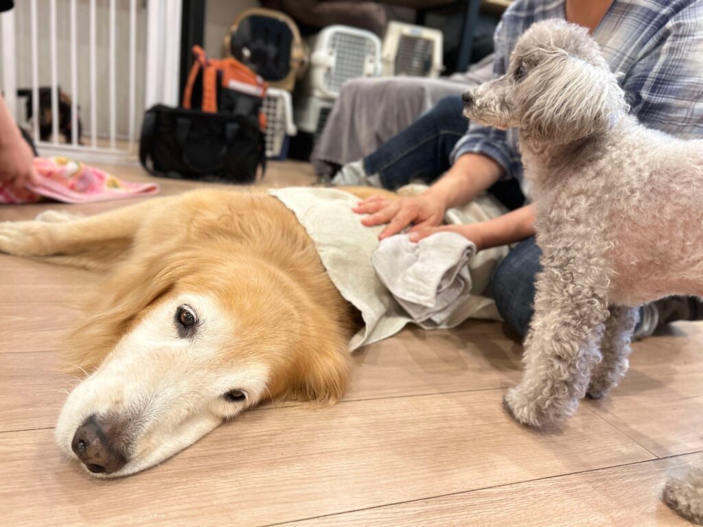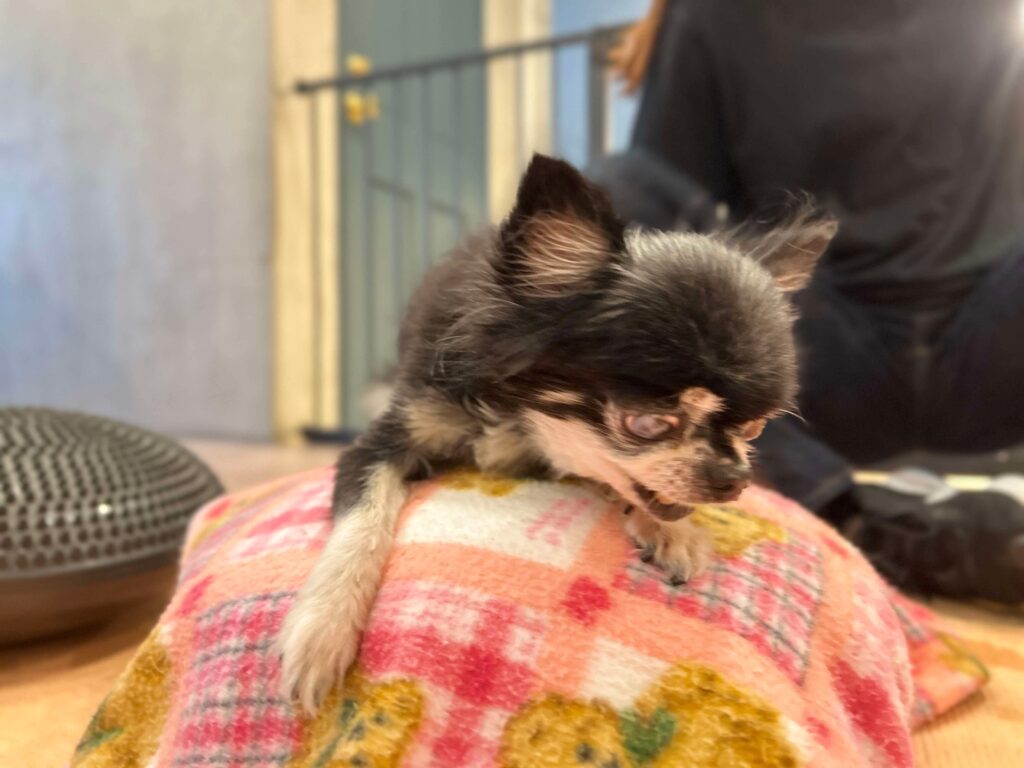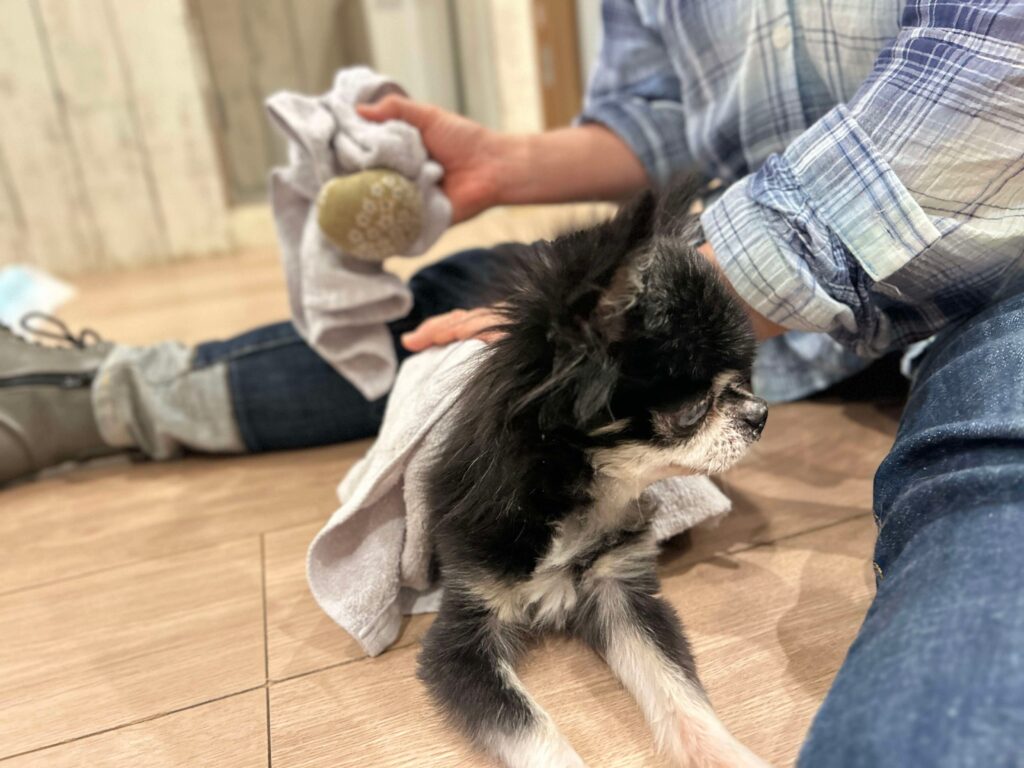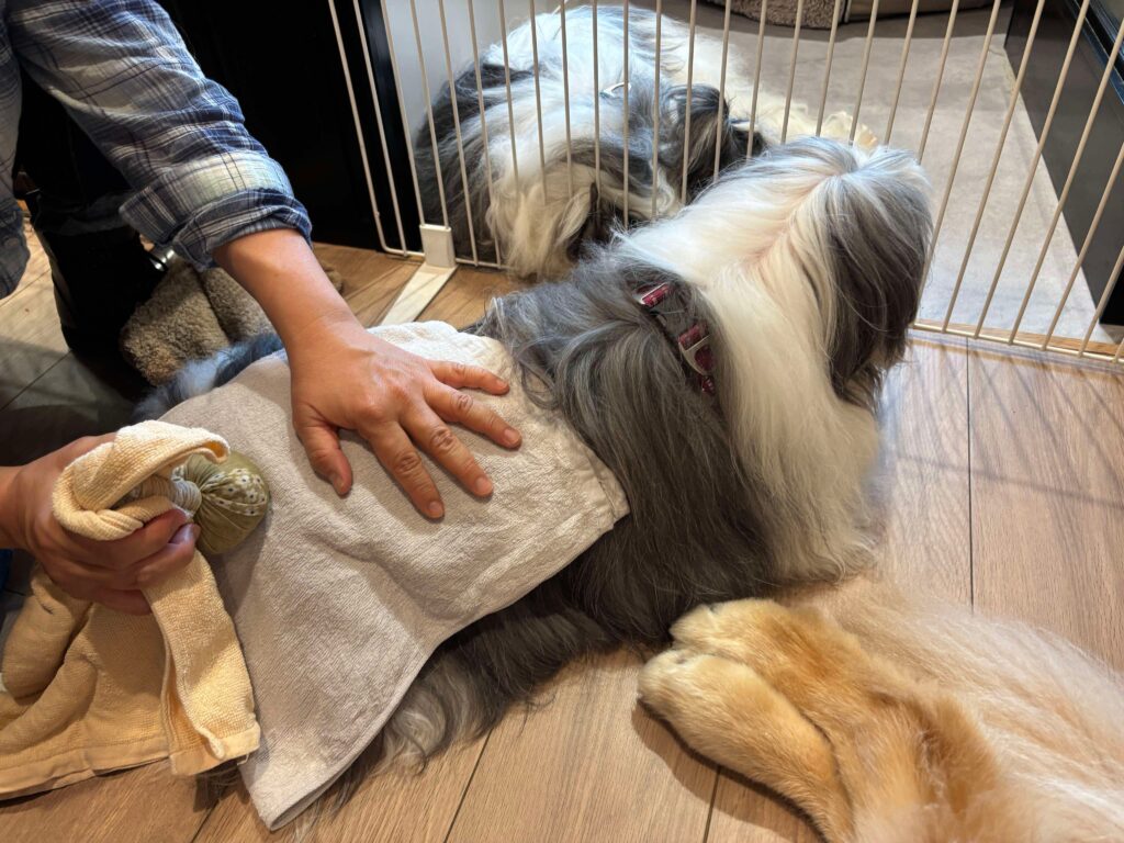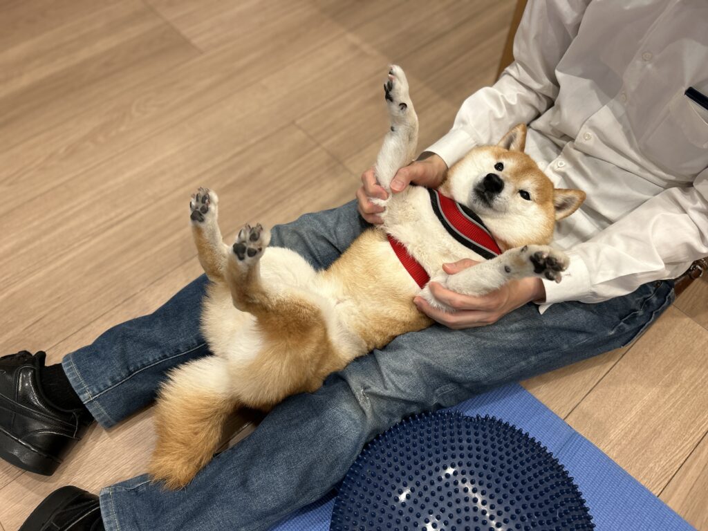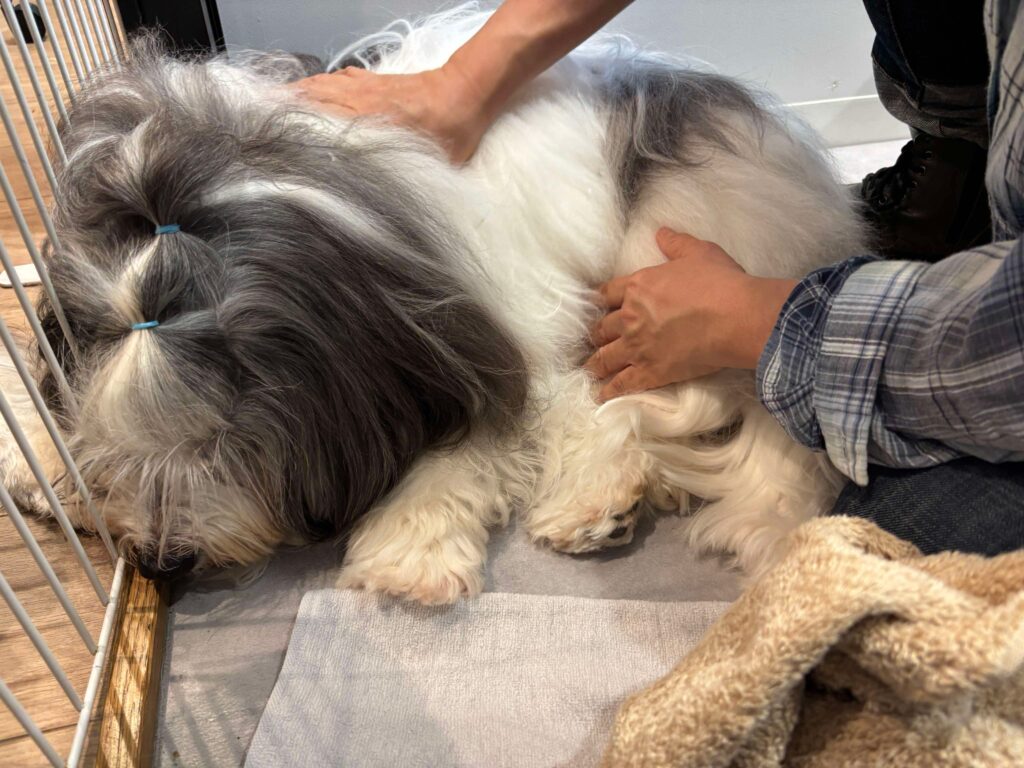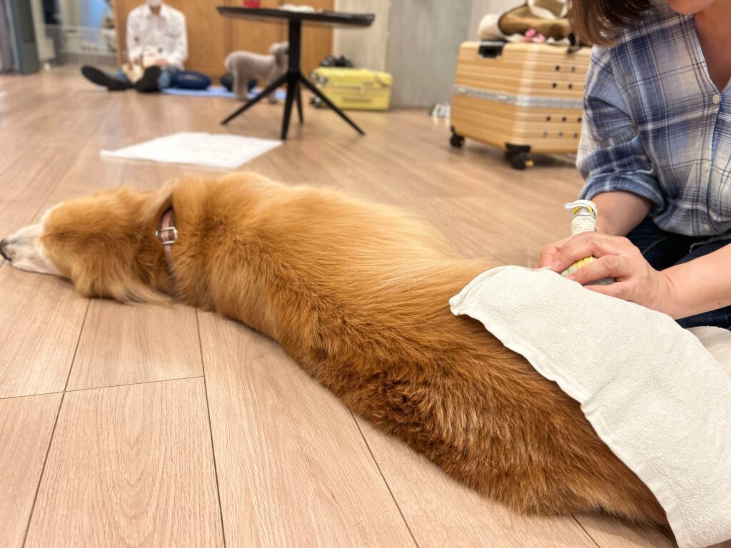 マッサージは手の平でゆる〜く、血流を良くするようにしてもらうと、寝転がって気持ちよさそうなれもんちゃんでした♪