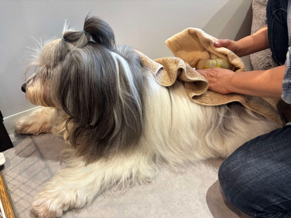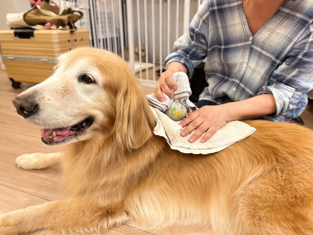 後脚、前脚、肩甲骨、背骨に沿ってハーブボールで温め、リンパマッサージを行いました。