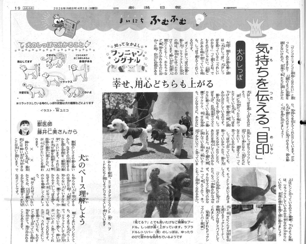 4月より共同通信加盟新聞社の子ども新聞に『知ってなかよしわんにゃんシグナル』犬部門の連載を代表:須﨑が担当することになりました。4月は、新潟日報・福島民報に「犬のしっぽ」の取材記事が掲載されました。クラスメイトが登場しています。